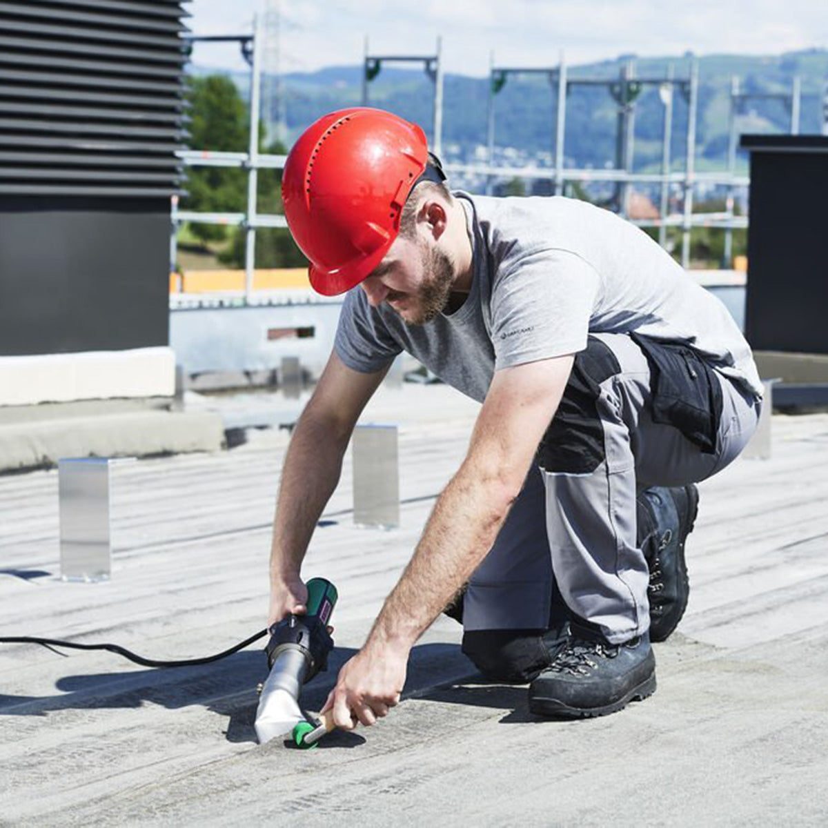 - Welding of bitumen sheets and plastic films: Perfectly suited for roofing needs when sealing flat roofs.