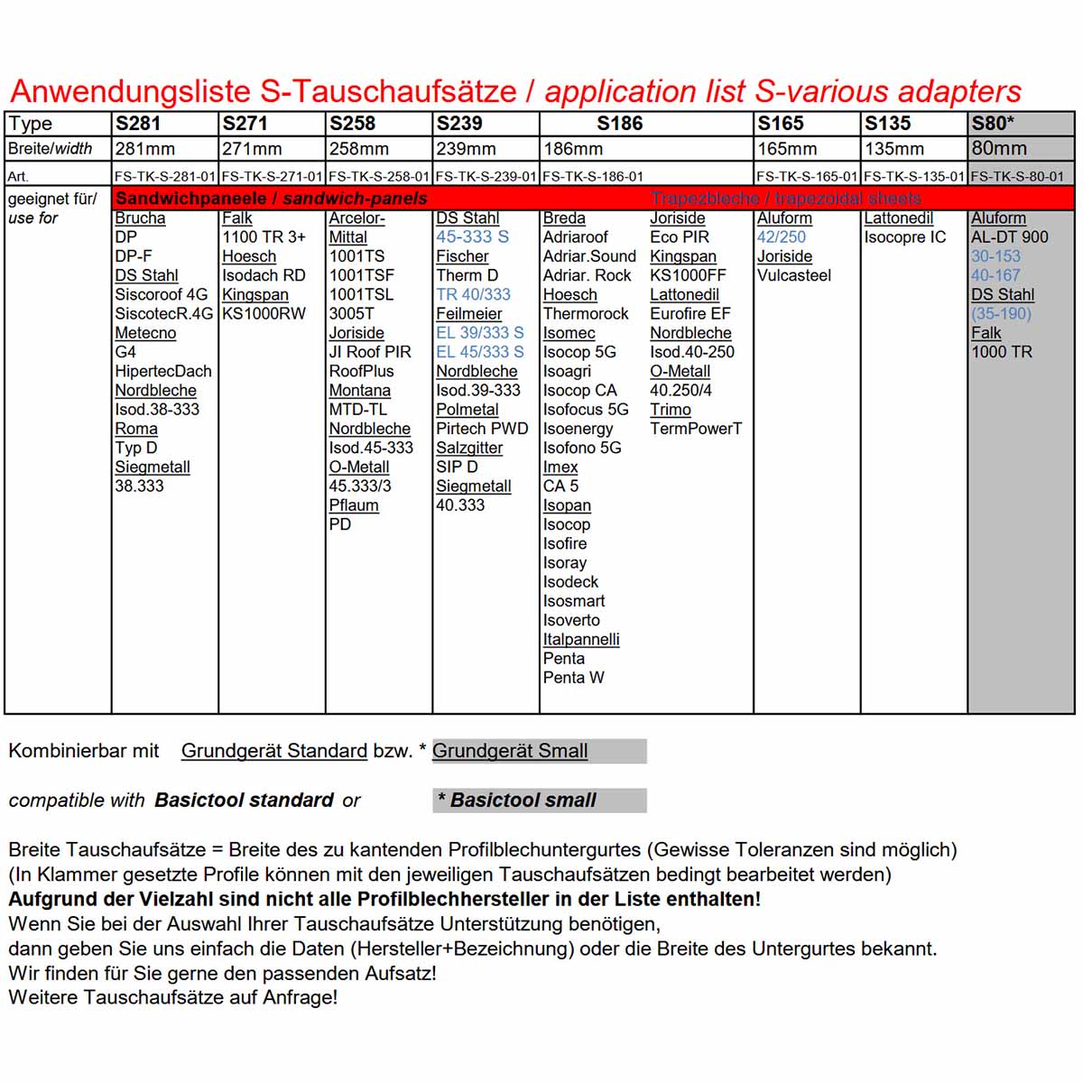 - Ensemble S:Avec attaches interchangeables (S281, S258) pour panneaux sandwich.