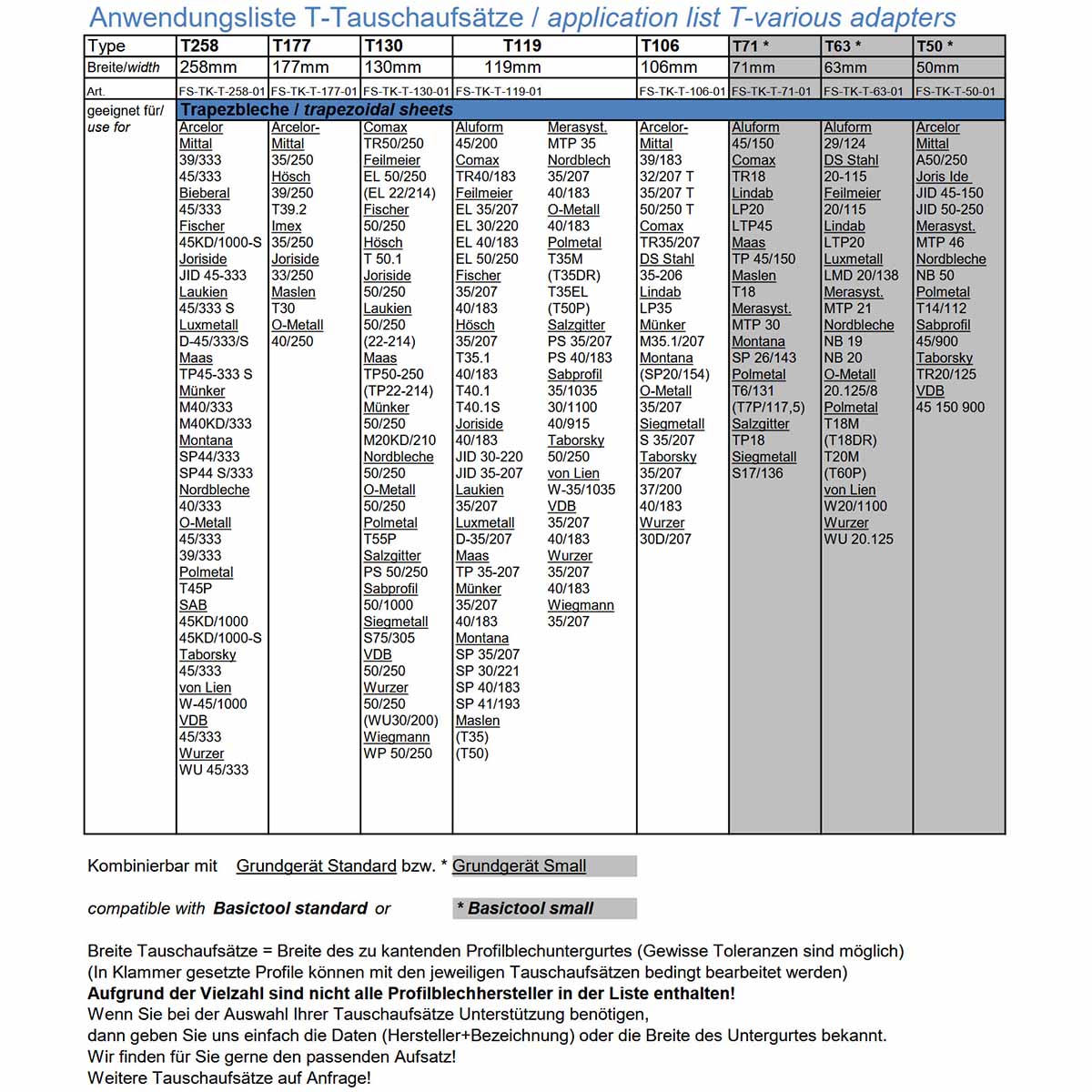 - ensemble T:Avec attaches interchangeables (T258, T119, T106) pour tôles trapézoïdales.