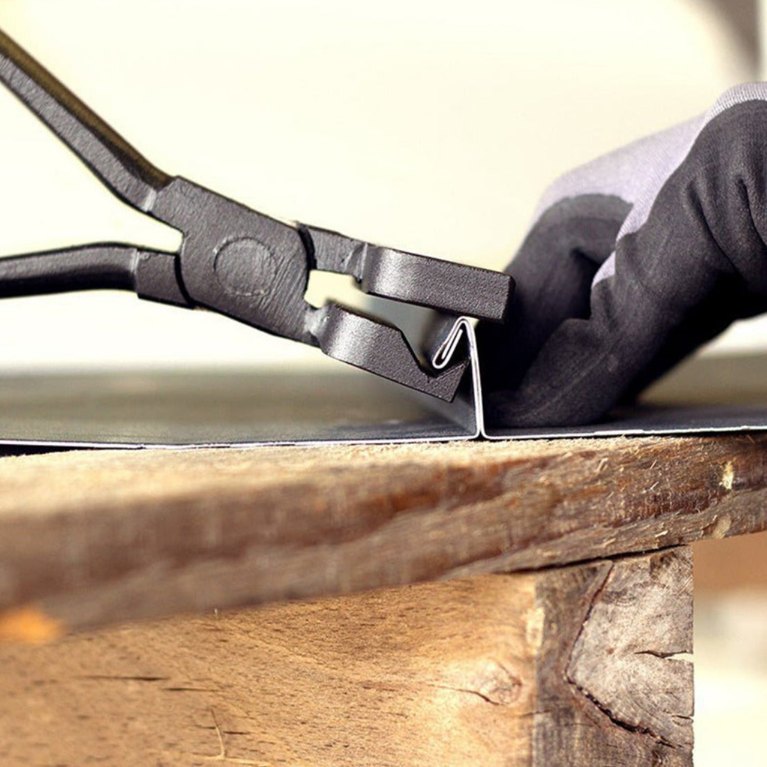 Schonendes Arbeiten: Dank ihrer innovativen Konstruktion verhindert die MASC - Falzaufbiegezange Beschädigungen am Material, was sie zu einem herausragenden Werkzeug für Dachdecker macht.